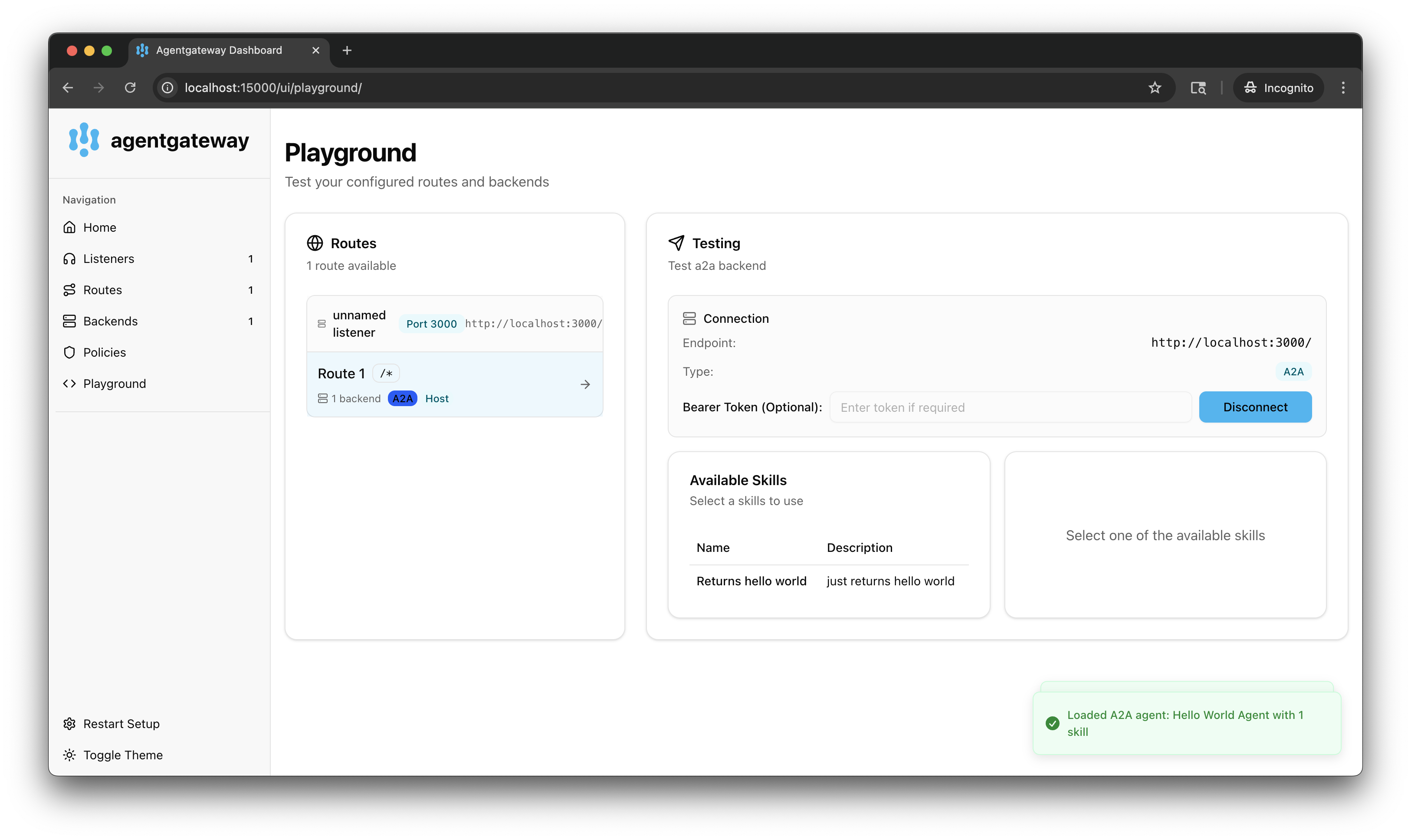 In the Connection Settings card, select your listener and the A2A target, and click Connect. The agentgateway UI connects to the A2A target and retrieves all the skills that the target provides.